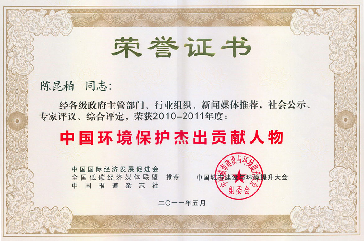 經(jīng)各級政府主管部門、行業(yè)組織、新聞媒體推薦,社會公示、專家評議、綜合評定,陳昆柏同志榮獲2010-2011年度“中國環(huán)境保護杰出貢獻人物”