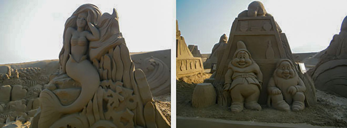 “沙雕故鄉(xiāng)、度假天堂”說得就是我們第一個(gè)到達(dá)的目的地:舟山朱家尖。朱家尖有清新、歡快的--海洋之旅;飄逸、灑脫的--休閑之旅;健康、明朗的--康體之旅。懷著這樣的憧憬,放下行李我們迫不及待的想去體驗(yàn)。果然,美輪美奐的沙雕景象,沖擊你的視覺體驗(yàn)。走進(jìn)以迪士尼卡通人物為主題的沙雕樂園里,帶你回到孩提時(shí)天真時(shí)代?,F(xiàn)在就用照片跟大家一起分享我們的快樂。