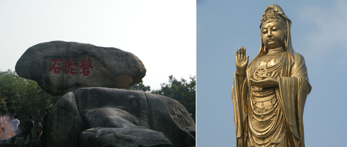 島四周金沙綿亙、白浪環(huán)繞,漁帆競發(fā),青峰翠巒、銀濤金沙環(huán)繞著大批古剎精舍,構(gòu)成了一幅幅絢麗多姿的畫卷,給人完美的視覺體驗(yàn)。巖壑奇秀,磐陀石、二龜聽法石、心字石、梵音洞、潮音洞、朝陽洞各呈奇姿,引人入勝。