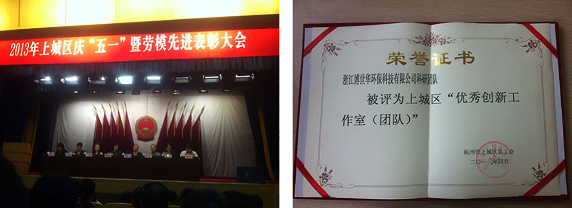 2013年4月26日,在2013年上城區(qū)慶“五一”暨勞模先進(jìn)表彰大會(huì)上,浙江博世華環(huán)??萍加邢薰究蒲袌F(tuán)隊(duì),經(jīng)申報(bào)評(píng)議,被上城區(qū)總工會(huì)授予“上城區(qū)優(yōu)秀創(chuàng)新團(tuán)隊(duì)”榮譽(yù)稱號(hào)。