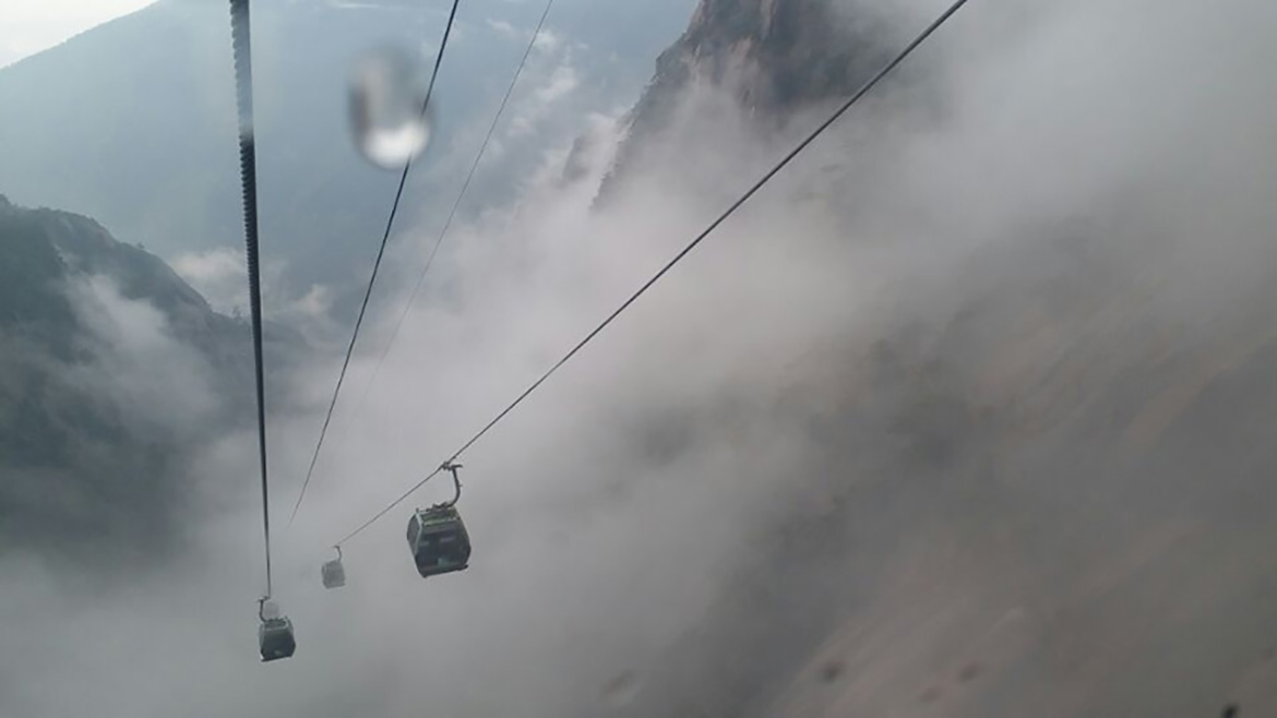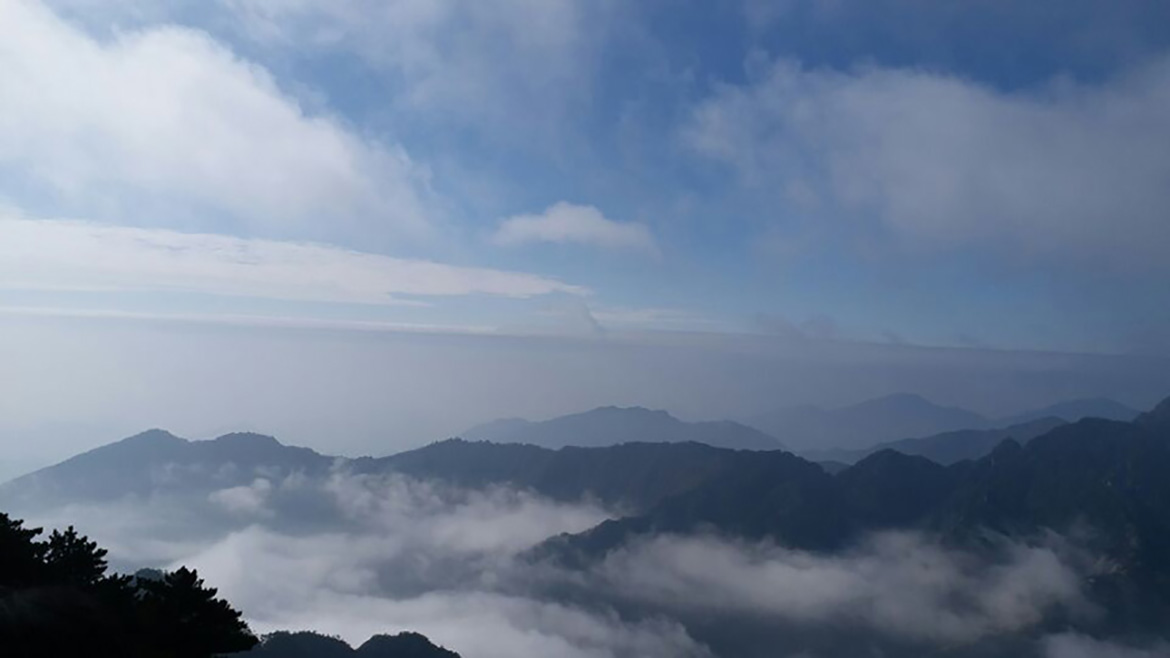 經(jīng)過漫長的排隊等候我們終于坐上了上山的纜車。隨著纜車的慢慢高升,纜車外霧氣越來越深,穿過云層后看到黃山的真面目,黃山上特有的松樹正向我們伸出手來歡迎我們呢! 真是好美??!