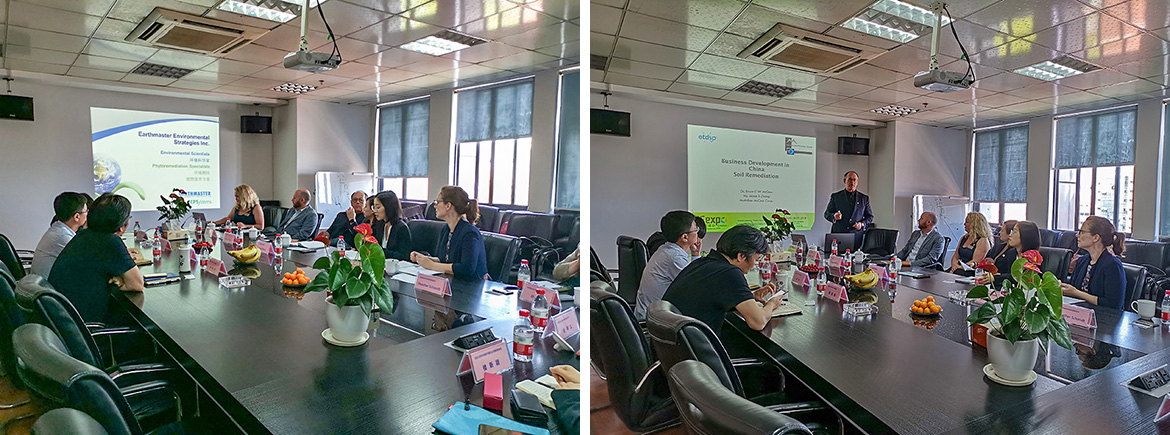 客人也分別介紹了自己公司的情況,Earthmaster業(yè)務發(fā)展副總裁Amber Flamand介紹該公司是一家專業(yè)的環(huán)境咨詢公司,具有二十余年的發(fā)展歷史,Earthmaster運營副總裁Adam Dunn詳細介紹了公司的主打技術(shù)——PEPSystems植物復育法及運用該技術(shù)成功修復污染土壤的工程案例。McMillian-McGee總裁Bruce McGee介紹McMillian-McGee是一家專注原位熱脫附修復技術(shù)的企業(yè),自主研發(fā)了多套專利技術(shù)進行污染土壤的原位熱脫附修復,并在全球范圍內(nèi)獲得廣泛使用。最后,博世華團隊分別就植物修復和原位熱脫附技術(shù)與來訪公司進行了交流和討論。