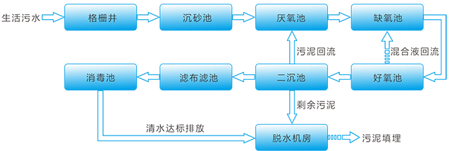 “格柵+沉砂池+改良型A2/O+二沉池+濾布濾池+紫外線消毒”工藝:進(jìn)水中漂浮物及粗大顆粒物被格柵攔截,然后進(jìn)入沉砂池,去除其中砂粒,防止其在后續(xù)構(gòu)筑物中沉積,出水進(jìn)入整個(gè)污水處理部分的核心部分改良型A2/O系統(tǒng),污水從厭氧池進(jìn)入生化處理系統(tǒng),依次流經(jīng)厭氧池、缺氧池、好氧池,同時(shí)混合液回流至缺氧池,出水排至二沉池,泥水分離,污泥回流至生化系統(tǒng),污水進(jìn)入濾布濾池,過濾后出水進(jìn)入紫外線消毒池,達(dá)標(biāo)后排放。