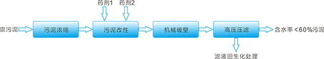 BSH-DeWa? 污泥改性、深度脫水技術(shù)采用“化學(xué)改性+機(jī)械破壁+高壓壓濾”的組合工藝,其工藝流程如下: